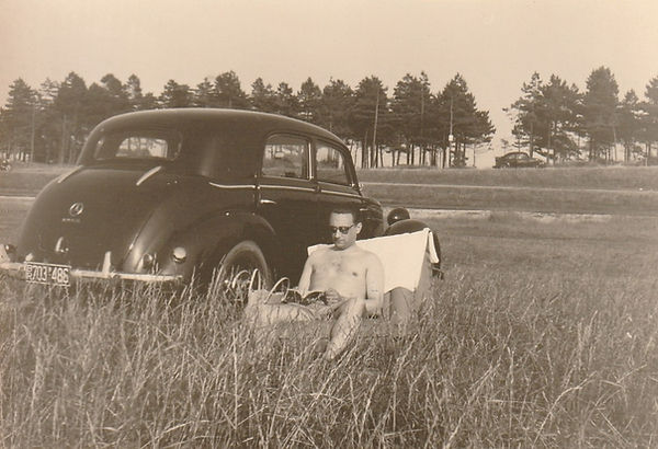 Ausflug einer Männerrunde im Jahr 1953 zum Bederkesaer See. Zugelassen in der amerikanischen Zone, AE für das Land Bremen, 34 für Bremerhaven-Stadt. Links ein Opel Olympia '51.