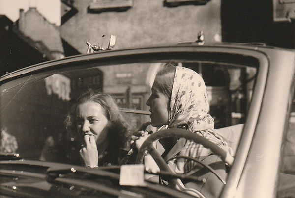 Unten: Die beiden Damen scheinen vom Photographen (womöglich mit böser Absicht) überrascht worden zu sein! Vielleicht ist man an einen der Berliner Seen zum (Sonnen-) Baden gefahren. Der Wagen links trägt jedenfalls ein Westberliner Kennzeichen (KB). Dessen Besitzer fürchtete wohl Benzinknappheit. Denn am Heck hatte er sage und schreibe sechs Spritkanister montiert.